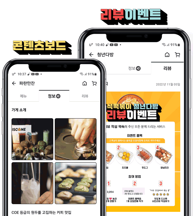 가게의 로고, 콘텐츠보드, 리뷰이벤트등 디자인요소는 사장님들이 직접 만들 수 있습니다.